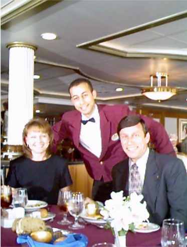 | Our Assistant Waitress, Carmen, was from Romania and was excellent with the Pepper Mill. | Hachim, our Waiter, was from Morocco, and always had our orders correct, even the four plates of Scampi for Mike. | Our Head Waiter, Bela, made sure everything was running smoothly and that everyone was happy. |